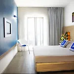 Gli interni belli di questo hotel economico, le camere luminose. C'erano un mini frigo e un asciugacapelli, tutto eccellente. Avevo una vista stupenda sul mare dalla mia finestra. Mi è piaciuta la spiaggia locale nelle vicinanze.